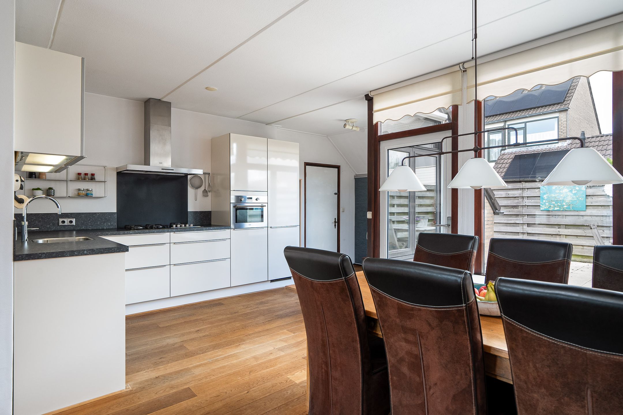 Zoek je een ruime, instapklare twee-onder-een-kapwoning in het gezellige Menaam? De woning aan Achterbosk 5 voldoet met zijn vier slaapkamers, en een garage met vliering aan alle eisen. Op de begane grond is een ruime woonkamer met een moderne open keuken. De oprit biedt een mooie eigen parkeerplek. Het is mooi wonen in Menaam! De woning is gelegen aan een rustige straat in het dorp Menaam, een dorp aan de westkant van Leeuwarden. Binnen tien minuten rijdt u met de auto naar de hoofdstad van Friesland, overigens ben je via de A31 ook dicht bij de overige dorpen en steden in de nabije omgeving, zoals Franeker. In het dorp zelf zijn voorzieningen als een supermarkt, basisschool, huisarts, kapper en sportfaciliteiten. Daarnaast zijn er enkele gezellige winkeltjes. En wandel gezellig door het Menaemer Voedselbos! Indeling: Entree, hal met toilet en fontein, woonkamer met tapis gelegde massief Frans eiken vloer en tuindeur. De open (Bricon) keuken uit 2012 is voorzien van een cooker, oven, vaatwasser, koel-vriescombinatie en vijfpits kookplaat. Tevens is er een witgoedopstelling en een binnendoorgang naar de aangebouwde garage met bergzolder. 1e verdieping: De trap met traprenovatie leidt naar de overloop, drie ruime slaapkamers waarvan n met vaste wastafel. De badkamer is met ligbad, tweede toilet, douche en vaste wastafel. 2e verdieping: Vaste trap, overloop met REMEHA HR CV-ketel (2011). De vierde slaapkamer is voorzien van een laminaatvloer, extra bergruimte en een Velux dakraam met zonwering. Bijzonderheden: - Energielabel B; - Waterontharder (eventueel ter overname); - 9 zonnepanelen PV-capaciteit 2.5 kWp; - Zonnescreens aan de voorzijde en gedeeltelijk achterzijde; - Ruime garage berging met vliering; - Houten tuinberging; - Bouwjaar 1976; - Glasvezelaansluiting in de meterkast; - Buitenschilderwerk 2015, meerdere malen onderhouden; - Totaal perceel oppervlakte 210 m2 eigen grond; - Speeltuintje vlakbij.