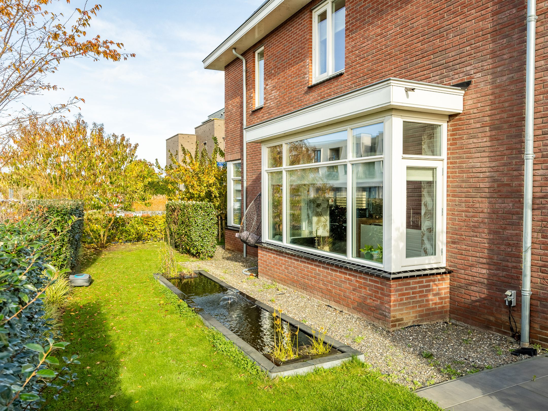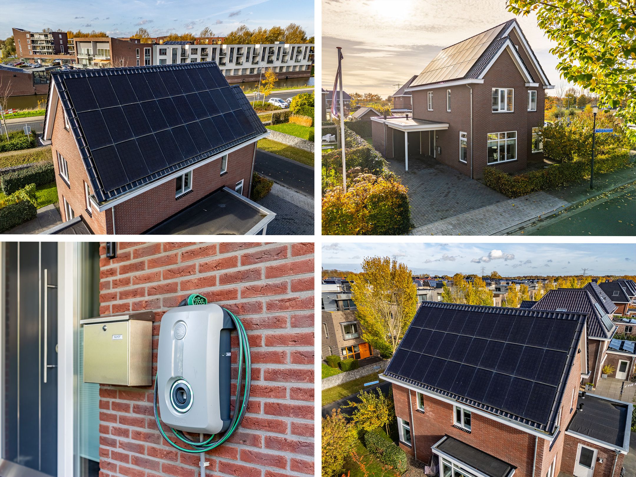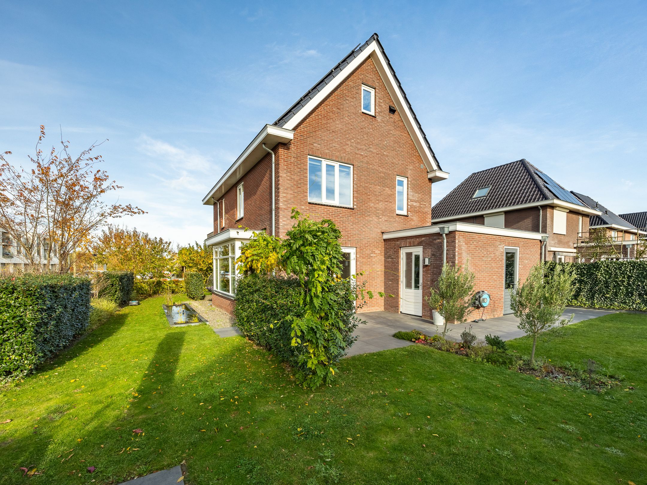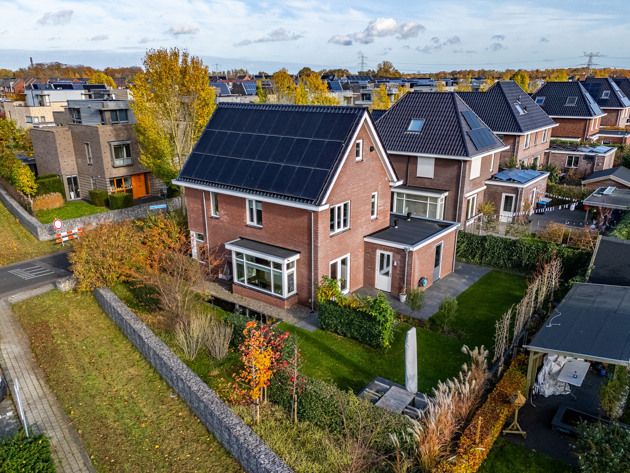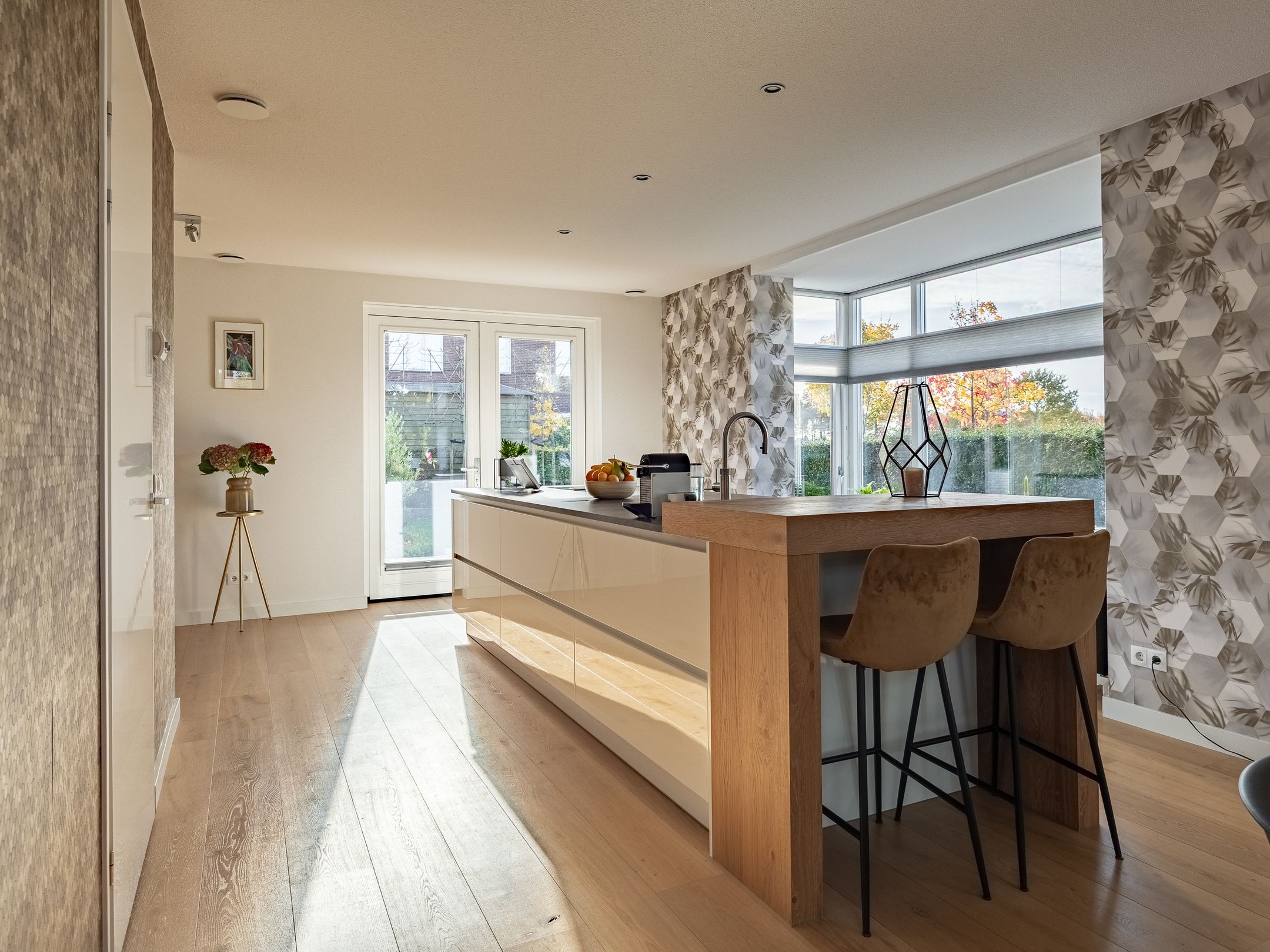 Duurzaam en vrijstaand wonen op de mooiste plek van de straat, met een zonnige tuin en uitzicht richting het water. Gasloos, maar liefst 60 zonnepanelen, elektrische paneelverwarming, een laadpaal en een Daikin warmtepompboiler voor warm water maken van dit huis een duurzaam droomhuis. Er zijn vier slaapkamers op de eerste verdieping en de tweede verdieping biedt ruimte om nog twee kamers te realiseren. Parkeren kan ruimschoots op eigen terrein, zowel buiten als in de garage. Het winkelcentrum met een supermarkt, winkels en sportschool vind je aan de andere kant van het water. Op fietsafstand zijn een basisschool en sportvoorzieningen, er is een skatebaan en er zijn meerdere speeltuintjes in de wijk. Binnen een paar minuten rij je op de N314 richting het centrum en omliggende dorpen. Loop een klein stukje en je bent in een uitgestrekt natuur- en wandelgebied richting Wichmond en Landgoed Hackfort. Indeling: Begane grond: De architectuur van deze villa, genspireerd op de geliefde jaren 30 stijl, trekt direct de aandacht. Om de binnenzijde te bewonderen loop je naar de carport, waar de fraaie entree is. Achter de voordeur bevindt zich de hal, met een zwarte trapopgang en een eikenhouten vloer. Deze vloer ligt niet alleen in de hal, maar ook in de woonkamer en keuken. Aan de linkerzijde, naast de meterkast, is de toiletruimte met fonteintje. Wat een sfeer heeft de speels ingedeelde woonkamer, die een geheel vormt met de keuken. Aan de voorzijde is het zitgedeelte, met uitzicht op de voortuin en de rustige straat. Het eetgedeelte is vlak naast de prachtige keuken, die ruimte biedt aan een groot kookeiland en een hoge kastenwand. In deze villa is de keuken het kloppend hart, waar een kookliefhebber op slag verliefd op wordt... Door de ramen bij de erker (west) en de openslaande tuindeuren naar de achtertuin (zuid) valt veel licht naar binnen. Het kookeiland heeft een hoge tweepersoonstafel, brede lades en een stijlvol aanrechtblad. Alle benodigde apparatuur, deels in de kastenwand, is ingebouwd: een Miele inductie kookplaat met afzuiging, een Quooker, vaatwasser, koel-vriescombinatie, oven en een stoomoven. Naast de keuken is een bijkeukenwasruimte, die toegang biedt tot de tuin en de garage. In de garage kun je de (kinder)fietsen, een scooter, motor enof andere spullen neerzetten. Liever de auto? De garage is er groot genoeg voor! Eerste verdieping: De overloop is een fraaie ruimte, met het zwarte trappenhuis en laminaat op de vloer. Deze ligt ook in de aansluitende slaapkamers, vier in totaal. Aan de achterzijde is de master bedroom, uitgevoerd in goud en nachtblauw. Er zijn twee ruime kamers aan de voorzijde en de vierde slaapkamer wordt als sportruimte gebruikt. Voor, tijdens en na het sporten heb je mooi uitzicht richting het water en groen. In de royale badkamer zijn marmerlook tegels en modern sanitair op een fraaie wijze gecombineerd. Het vrijstaande bad staat bij het raam en verder zijn er een inloopdouche, een toilet en een stijlvol wastafelmeubel met ronde spiegel. Tweede verdieping: Een vaste trap geeft toegang tot de zeer ruime tweede verdieping, met een bijna 3.50 meter hoge nok en een raam in de voor- en achtergevel. Er ligt, net als op de eerste verdieping, laminaat op de vloer en de wanden zijn afgewerkt met behang. Dankzij de gunstige positie van de trap kunnen hier eenvoudig twee ruime slaapkamers en een wasruimte worden gerealiseerd. Tuin: De villa wordt aan drie kanten omringd door een mooi aangelegde tuin waardoor je de hele dag zon hebt, merendeels op het zuiden (achterzijde) en westen (rechterzijde). Er zijn twee terrassen om volop in de zon te zitten en de gevarieerde beplanting zorgt voor een aangename sfeer. Aan de linkerzijde, naast de garage, is een brede achterom en aan de andere zijde is een stijlvolle vijver gemaakt. De oprit aan de voorzijde biedt plaats voor 2 auto's. Bijzonderheden: - Dak-, gevel- en vloerisolatie; - Houten kozijnen met HR+++ glas; - Elektrische paneelverwarming (met wifi-functie) in de woonkamer, keuken en slaapkamers; - Elektrische vloerverwarming (Danfoss) in de badkamer; - Warm water via een warmtepompboiler (Daikin) en een Quooker; - 60 AEG glas-glas zonnepanelen van 300 Wp, geplaatst in 2019; - Balansventilatie aanwezig en voorbereiding voor een centraal stofzuigsysteem; - Oprit met carport en laadpaal; - Mogelijkheid tot het creren van 6 slaapkamers, door 2 extra slaapkamers te realiseren op de tweede verdieping; - Energielabel A+++
