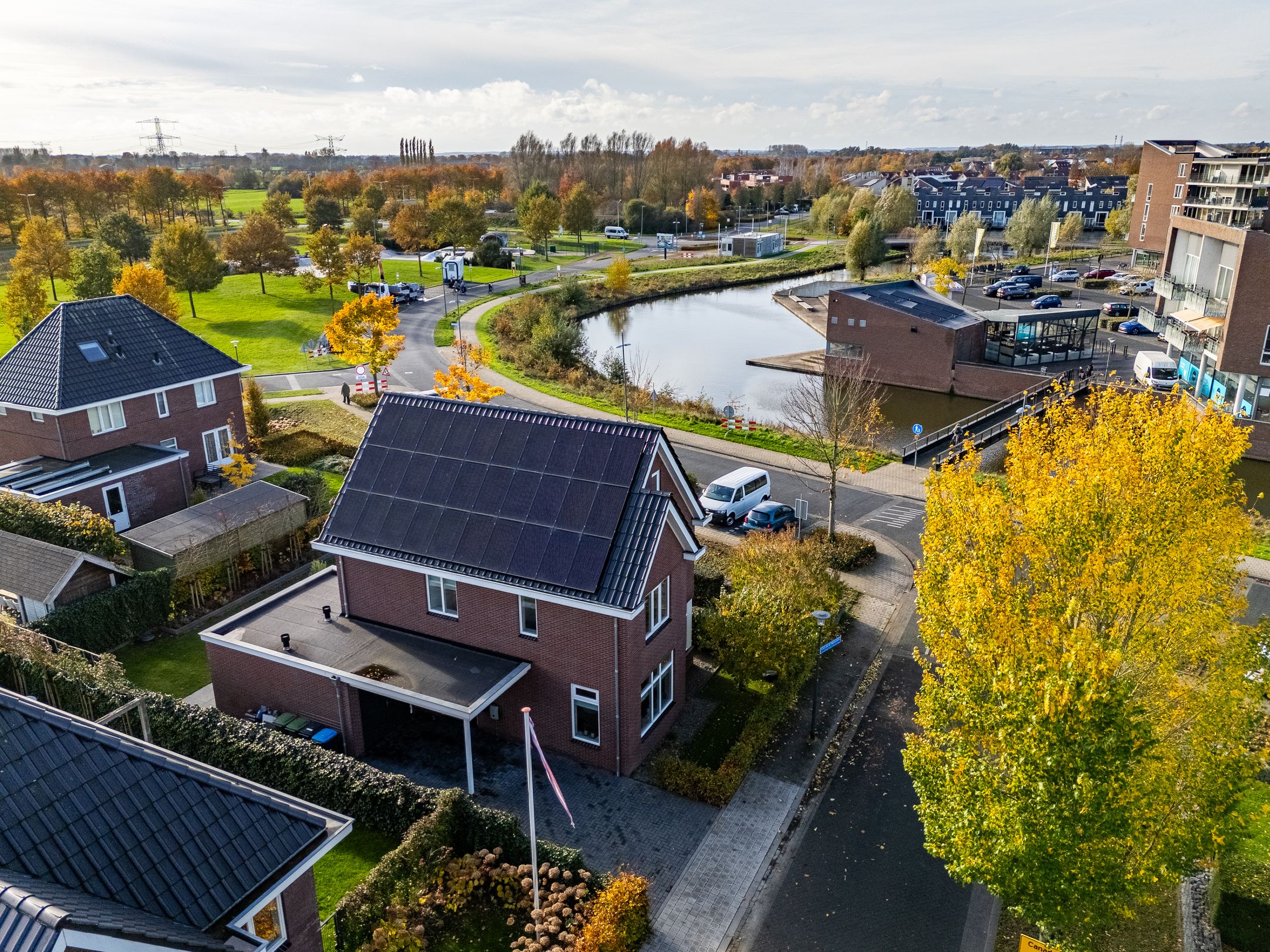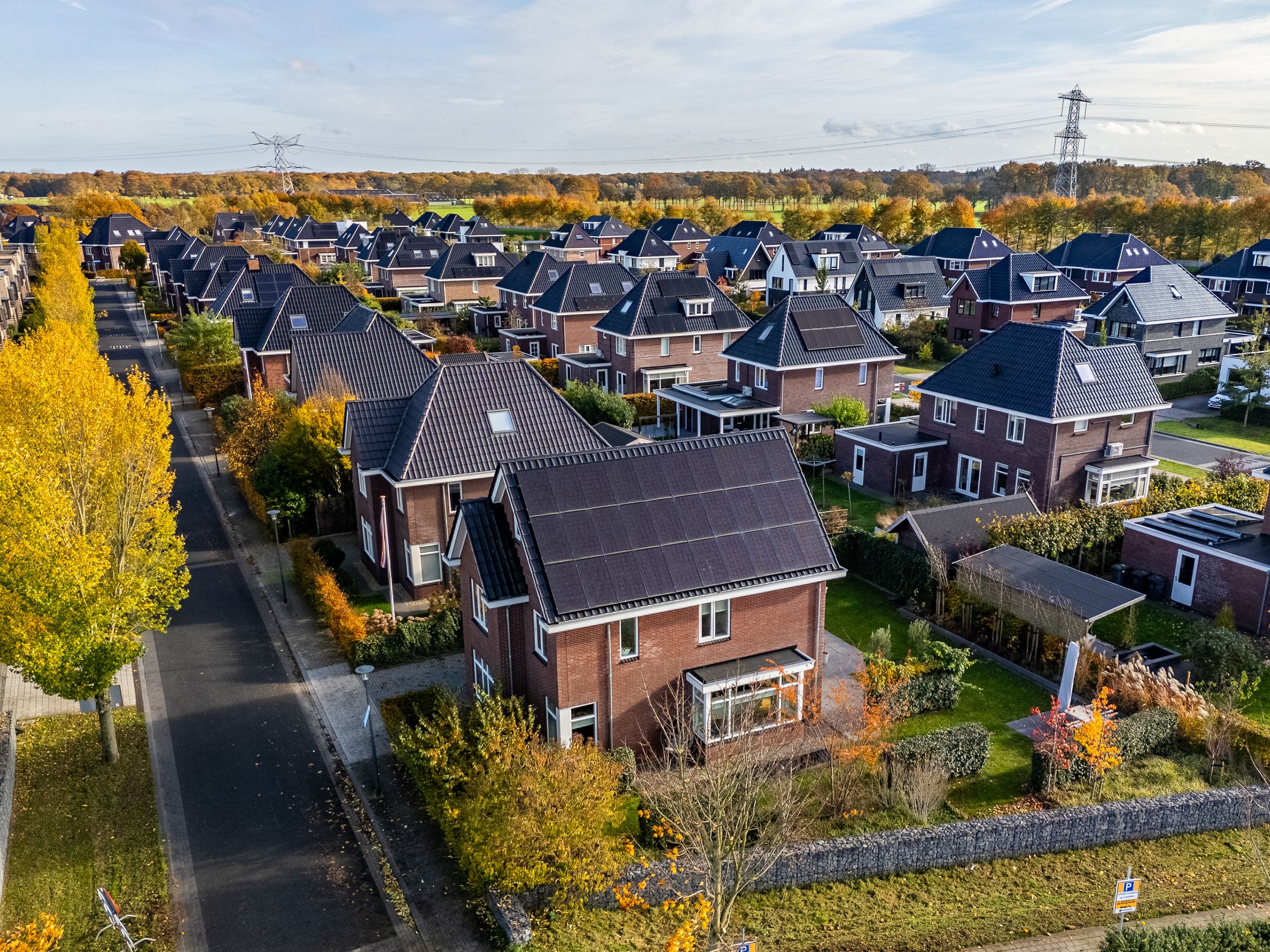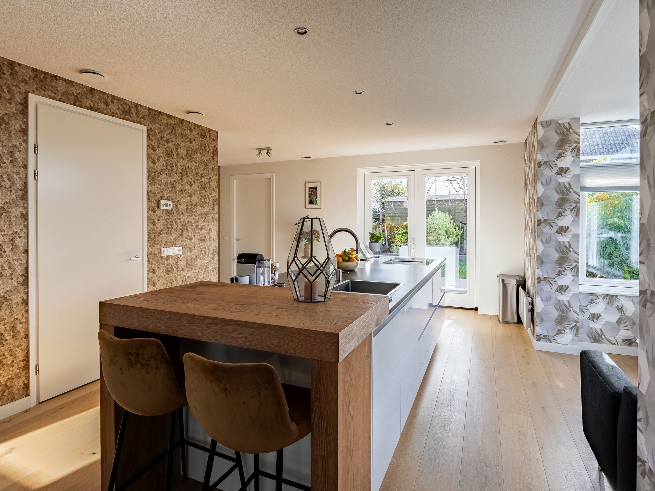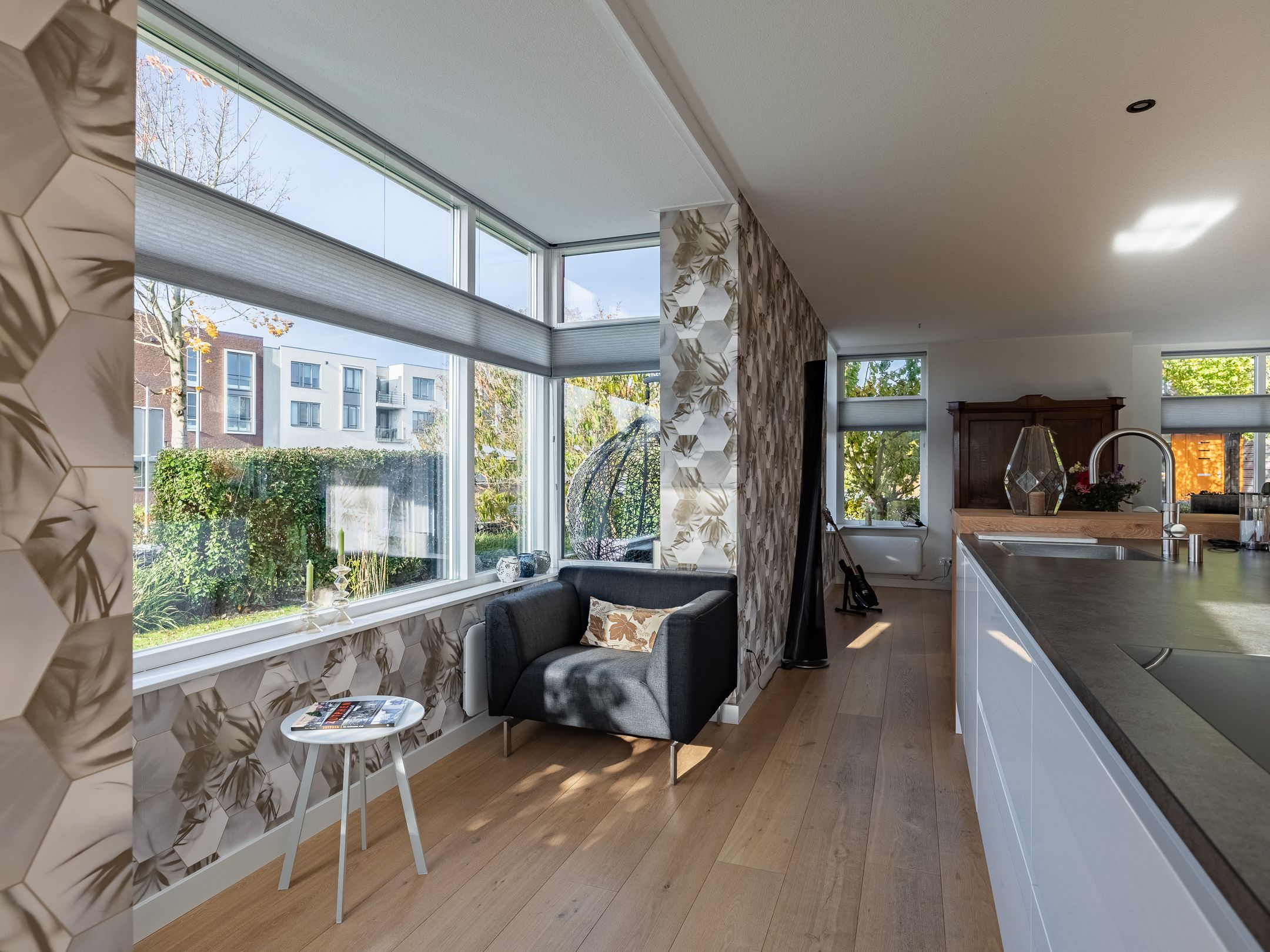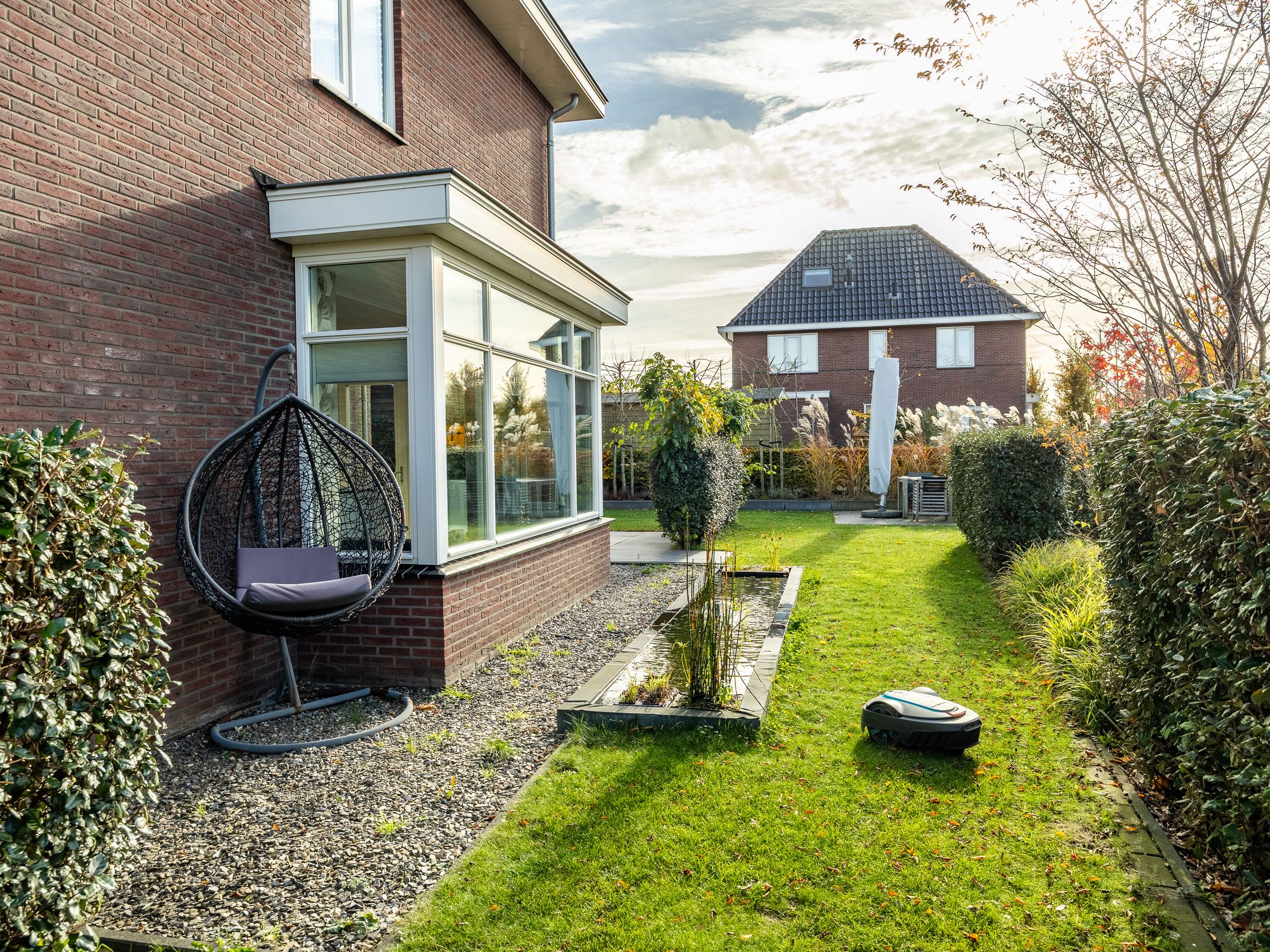 Duurzaam en vrijstaand wonen op de mooiste plek van de straat, met een zonnige tuin en uitzicht richting het water. Gasloos, maar liefst 60 zonnepanelen, elektrische paneelverwarming, een laadpaal en een Daikin warmtepompboiler voor warm water maken van dit huis een duurzaam droomhuis. Er zijn vier slaapkamers op de eerste verdieping en de tweede verdieping biedt ruimte om nog twee kamers te realiseren. Parkeren kan ruimschoots op eigen terrein, zowel buiten als in de garage. Het winkelcentrum met een supermarkt, winkels en sportschool vind je aan de andere kant van het water. Op fietsafstand zijn een basisschool en sportvoorzieningen, er is een skatebaan en er zijn meerdere speeltuintjes in de wijk. Binnen een paar minuten rij je op de N314 richting het centrum en omliggende dorpen. Loop een klein stukje en je bent in een uitgestrekt natuur- en wandelgebied richting Wichmond en Landgoed Hackfort. Indeling: Begane grond: De architectuur van deze villa, genspireerd op de geliefde jaren 30 stijl, trekt direct de aandacht. Om de binnenzijde te bewonderen loop je naar de carport, waar de fraaie entree is. Achter de voordeur bevindt zich de hal, met een zwarte trapopgang en een eikenhouten vloer. Deze vloer ligt niet alleen in de hal, maar ook in de woonkamer en keuken. Aan de linkerzijde, naast de meterkast, is de toiletruimte met fonteintje. Wat een sfeer heeft de speels ingedeelde woonkamer, die een geheel vormt met de keuken. Aan de voorzijde is het zitgedeelte, met uitzicht op de voortuin en de rustige straat. Het eetgedeelte is vlak naast de prachtige keuken, die ruimte biedt aan een groot kookeiland en een hoge kastenwand. In deze villa is de keuken het kloppend hart, waar een kookliefhebber op slag verliefd op wordt... Door de ramen bij de erker (west) en de openslaande tuindeuren naar de achtertuin (zuid) valt veel licht naar binnen. Het kookeiland heeft een hoge tweepersoonstafel, brede lades en een stijlvol aanrechtblad. Alle benodigde apparatuur, deels in de kastenwand, is ingebouwd: een Miele inductie kookplaat met afzuiging, een Quooker, vaatwasser, koel-vriescombinatie, oven en een stoomoven. Naast de keuken is een bijkeukenwasruimte, die toegang biedt tot de tuin en de garage. In de garage kun je de (kinder)fietsen, een scooter, motor enof andere spullen neerzetten. Liever de auto? De garage is er groot genoeg voor! Eerste verdieping: De overloop is een fraaie ruimte, met het zwarte trappenhuis en laminaat op de vloer. Deze ligt ook in de aansluitende slaapkamers, vier in totaal. Aan de achterzijde is de master bedroom, uitgevoerd in goud en nachtblauw. Er zijn twee ruime kamers aan de voorzijde en de vierde slaapkamer wordt als sportruimte gebruikt. Voor, tijdens en na het sporten heb je mooi uitzicht richting het water en groen. In de royale badkamer zijn marmerlook tegels en modern sanitair op een fraaie wijze gecombineerd. Het vrijstaande bad staat bij het raam en verder zijn er een inloopdouche, een toilet en een stijlvol wastafelmeubel met ronde spiegel. Tweede verdieping: Een vaste trap geeft toegang tot de zeer ruime tweede verdieping, met een bijna 3.50 meter hoge nok en een raam in de voor- en achtergevel. Er ligt, net als op de eerste verdieping, laminaat op de vloer en de wanden zijn afgewerkt met behang. Dankzij de gunstige positie van de trap kunnen hier eenvoudig twee ruime slaapkamers en een wasruimte worden gerealiseerd. Tuin: De villa wordt aan drie kanten omringd door een mooi aangelegde tuin waardoor je de hele dag zon hebt, merendeels op het zuiden (achterzijde) en westen (rechterzijde). Er zijn twee terrassen om volop in de zon te zitten en de gevarieerde beplanting zorgt voor een aangename sfeer. Aan de linkerzijde, naast de garage, is een brede achterom en aan de andere zijde is een stijlvolle vijver gemaakt. De oprit aan de voorzijde biedt plaats voor 2 auto's. Bijzonderheden: - Dak-, gevel- en vloerisolatie; - Houten kozijnen met HR+++ glas; - Elektrische paneelverwarming (met wifi-functie) in de woonkamer, keuken en slaapkamers; - Elektrische vloerverwarming (Danfoss) in de badkamer; - Warm water via een warmtepompboiler (Daikin) en een Quooker; - 60 AEG glas-glas zonnepanelen van 300 Wp, geplaatst in 2019; - Balansventilatie aanwezig en voorbereiding voor een centraal stofzuigsysteem; - Oprit met carport en laadpaal; - Mogelijkheid tot het creren van 6 slaapkamers, door 2 extra slaapkamers te realiseren op de tweede verdieping; - Energielabel A+++