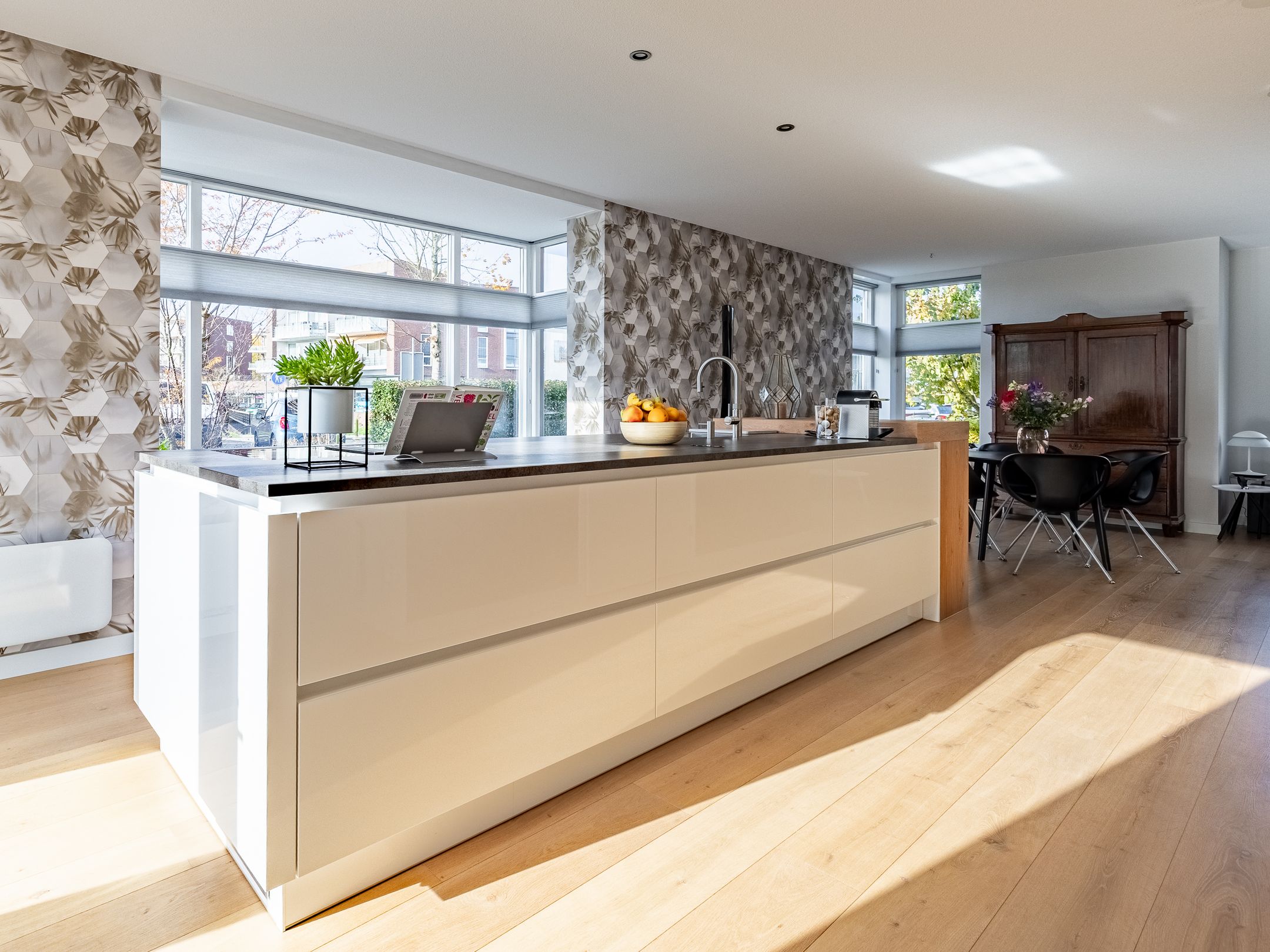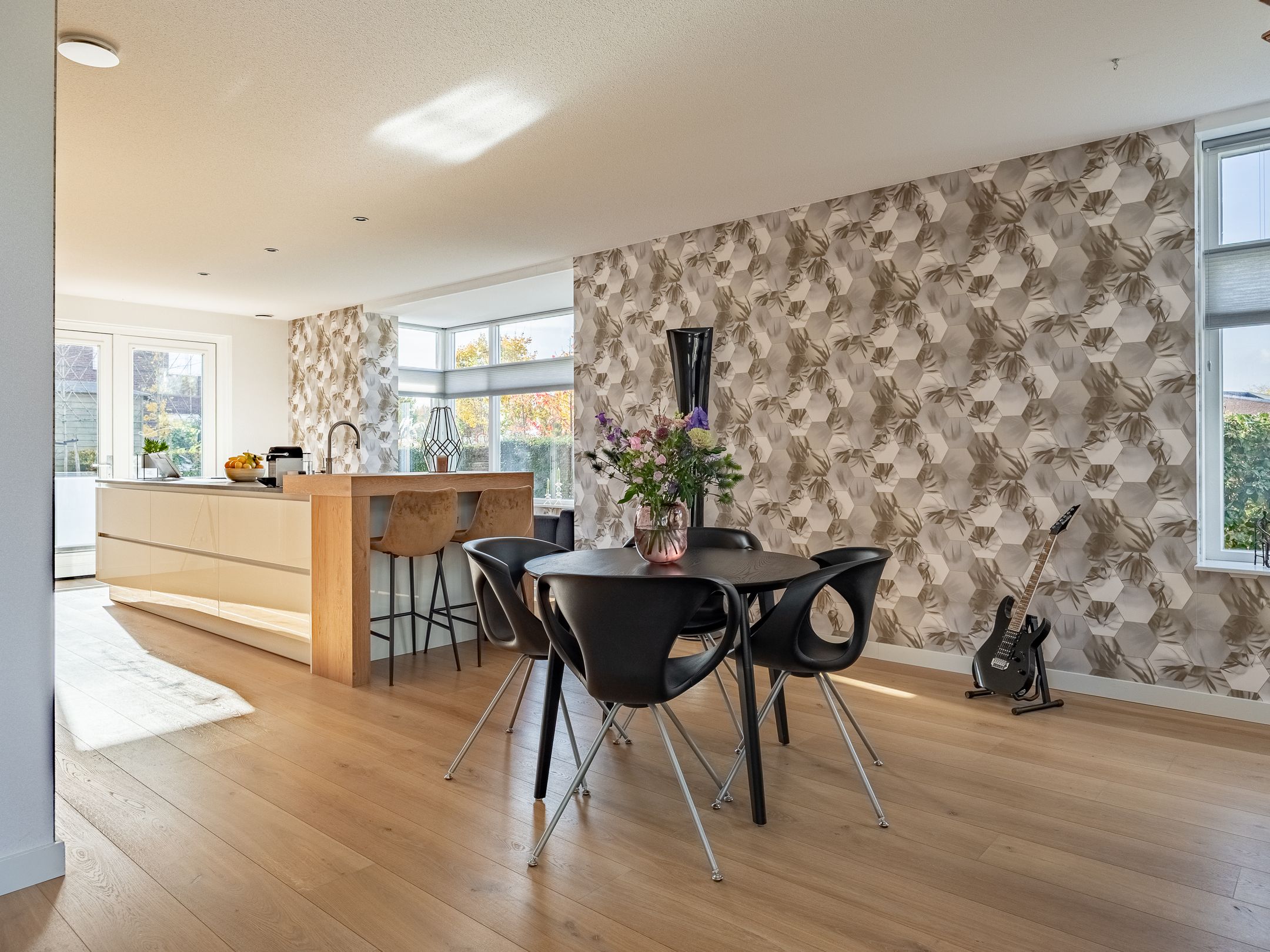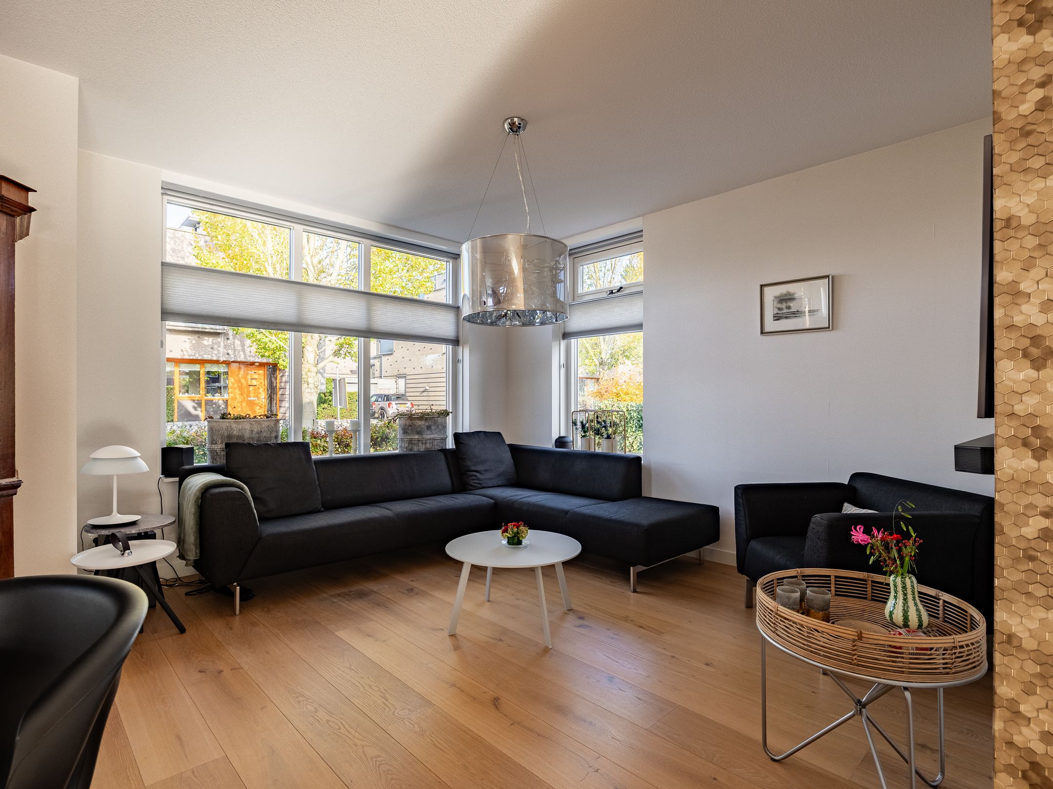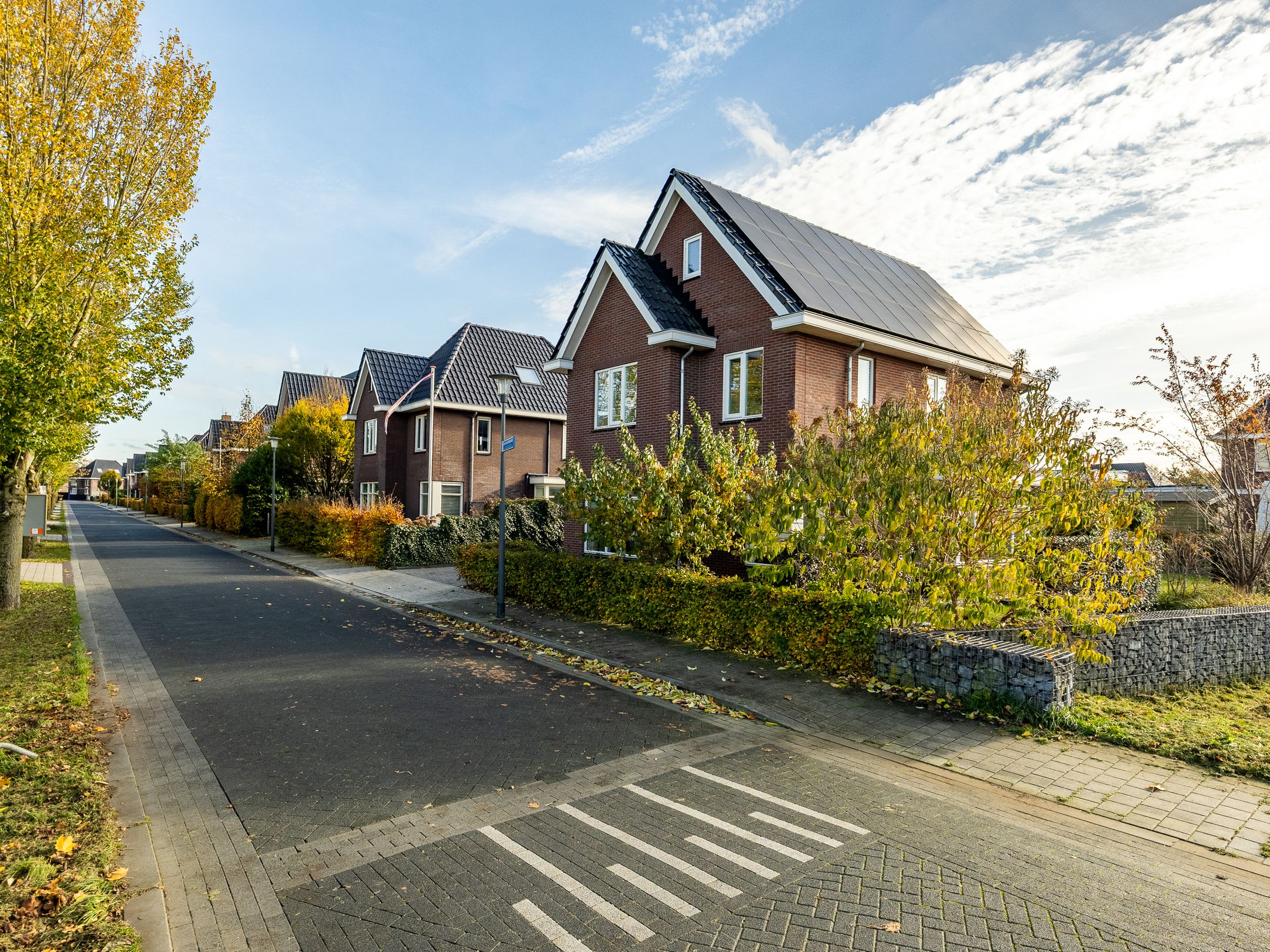 Duurzaam en vrijstaand wonen op de mooiste plek van de straat, met een zonnige tuin en uitzicht richting het water. Gasloos, maar liefst 60 zonnepanelen, elektrische paneelverwarming, een laadpaal en een Daikin warmtepompboiler voor warm water maken van dit huis een duurzaam droomhuis. Er zijn vier slaapkamers op de eerste verdieping en de tweede verdieping biedt ruimte om nog twee kamers te realiseren. Parkeren kan ruimschoots op eigen terrein, zowel buiten als in de garage. Het winkelcentrum met een supermarkt, winkels en sportschool vind je aan de andere kant van het water. Op fietsafstand zijn een basisschool en sportvoorzieningen, er is een skatebaan en er zijn meerdere speeltuintjes in de wijk. Binnen een paar minuten rij je op de N314 richting het centrum en omliggende dorpen. Loop een klein stukje en je bent in een uitgestrekt natuur- en wandelgebied richting Wichmond en Landgoed Hackfort. Indeling: Begane grond: De architectuur van deze villa, genspireerd op de geliefde jaren 30 stijl, trekt direct de aandacht. Om de binnenzijde te bewonderen loop je naar de carport, waar de fraaie entree is. Achter de voordeur bevindt zich de hal, met een zwarte trapopgang en een eikenhouten vloer. Deze vloer ligt niet alleen in de hal, maar ook in de woonkamer en keuken. Aan de linkerzijde, naast de meterkast, is de toiletruimte met fonteintje. Wat een sfeer heeft de speels ingedeelde woonkamer, die een geheel vormt met de keuken. Aan de voorzijde is het zitgedeelte, met uitzicht op de voortuin en de rustige straat. Het eetgedeelte is vlak naast de prachtige keuken, die ruimte biedt aan een groot kookeiland en een hoge kastenwand. In deze villa is de keuken het kloppend hart, waar een kookliefhebber op slag verliefd op wordt... Door de ramen bij de erker (west) en de openslaande tuindeuren naar de achtertuin (zuid) valt veel licht naar binnen. Het kookeiland heeft een hoge tweepersoonstafel, brede lades en een stijlvol aanrechtblad. Alle benodigde apparatuur, deels in de kastenwand, is ingebouwd: een Miele inductie kookplaat met afzuiging, een Quooker, vaatwasser, koel-vriescombinatie, oven en een stoomoven. Naast de keuken is een bijkeukenwasruimte, die toegang biedt tot de tuin en de garage. In de garage kun je de (kinder)fietsen, een scooter, motor enof andere spullen neerzetten. Liever de auto? De garage is er groot genoeg voor! Eerste verdieping: De overloop is een fraaie ruimte, met het zwarte trappenhuis en laminaat op de vloer. Deze ligt ook in de aansluitende slaapkamers, vier in totaal. Aan de achterzijde is de master bedroom, uitgevoerd in goud en nachtblauw. Er zijn twee ruime kamers aan de voorzijde en de vierde slaapkamer wordt als sportruimte gebruikt. Voor, tijdens en na het sporten heb je mooi uitzicht richting het water en groen. In de royale badkamer zijn marmerlook tegels en modern sanitair op een fraaie wijze gecombineerd. Het vrijstaande bad staat bij het raam en verder zijn er een inloopdouche, een toilet en een stijlvol wastafelmeubel met ronde spiegel. Tweede verdieping: Een vaste trap geeft toegang tot de zeer ruime tweede verdieping, met een bijna 3.50 meter hoge nok en een raam in de voor- en achtergevel. Er ligt, net als op de eerste verdieping, laminaat op de vloer en de wanden zijn afgewerkt met behang. Dankzij de gunstige positie van de trap kunnen hier eenvoudig twee ruime slaapkamers en een wasruimte worden gerealiseerd. Tuin: De villa wordt aan drie kanten omringd door een mooi aangelegde tuin waardoor je de hele dag zon hebt, merendeels op het zuiden (achterzijde) en westen (rechterzijde). Er zijn twee terrassen om volop in de zon te zitten en de gevarieerde beplanting zorgt voor een aangename sfeer. Aan de linkerzijde, naast de garage, is een brede achterom en aan de andere zijde is een stijlvolle vijver gemaakt. De oprit aan de voorzijde biedt plaats voor 2 auto's. Bijzonderheden: - Dak-, gevel- en vloerisolatie; - Houten kozijnen met HR+++ glas; - Elektrische paneelverwarming (met wifi-functie) in de woonkamer, keuken en slaapkamers; - Elektrische vloerverwarming (Danfoss) in de badkamer; - Warm water via een warmtepompboiler (Daikin) en een Quooker; - 60 AEG glas-glas zonnepanelen van 300 Wp, geplaatst in 2019; - Balansventilatie aanwezig en voorbereiding voor een centraal stofzuigsysteem; - Oprit met carport en laadpaal; - Mogelijkheid tot het creren van 6 slaapkamers, door 2 extra slaapkamers te realiseren op de tweede verdieping; - Energielabel A+++