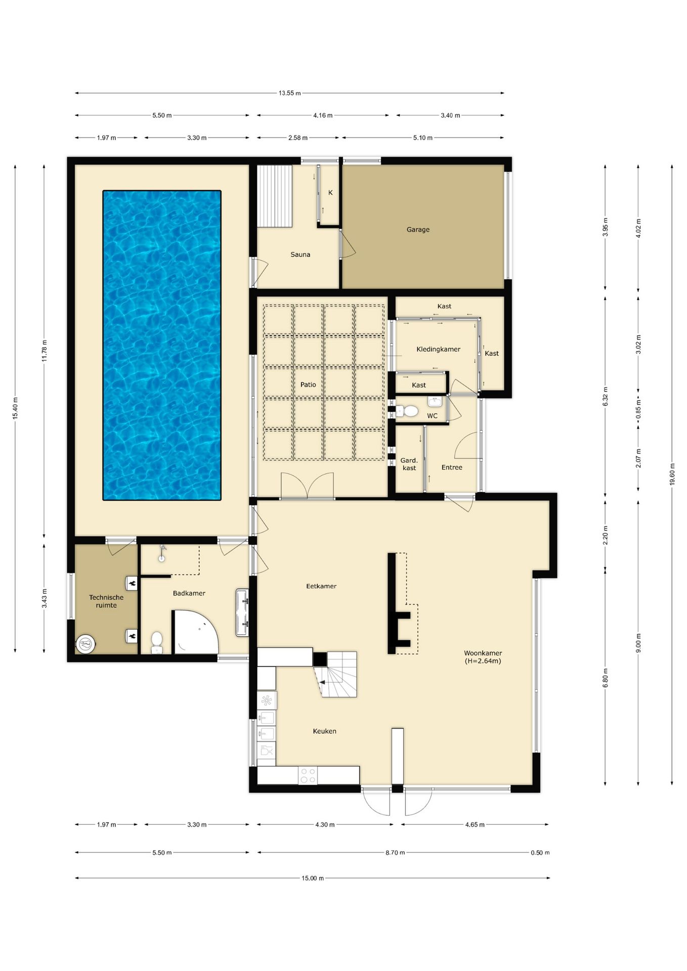 Wonen aan de bosrand en elke dag wandelen op het strand? Dan is dit uw droomhuis! Deze vrijstaande semi-bungalow met 2 (mogelijkheid tot meer) slaapkamers, garage en inpandig zwembad ligt op een fraaie locatie in het stranddorp Rockanje. De zonnige woning is gelegen op een perceel van 840 m2 eigen grond, is gebouwd in 1971 en heeft een woonoppervlak van ca. 264 m2. De tuin met groot terras biedt veel privacy. Verwarming middels 2 geschakelde CV-ketels. Royale parkeermogelijkheid op eigen terrein. Bos en strand zijn op loopafstand en Rotterdam is bereikbaar in 30 minuten! Omschrijving Voor het huis is er royaal parkeergelegenheid voor meerdere auto's. Begane grond: Centraal gelegen entree v.v. garderobekast, betegeld toilet met fonteintje en toegang tot de living en kastenkamer. Living - ca. 9.00 x 4.65 m Een heerlijke zonnige, royale living met gashaard en grote raampartijen, gelegen aan de voorzijde van het huis. De gashaard scheidt de living van de woonkeuken. De vloer is v.v. tapijt en de ramen zijn v.v. rolluiken. De tuin is vanuit de living te bereiken. Woonkeuken - ca. 9.00 x 4.30 m Riante woonkeuken aan de achterzijde van de woning. De neutrale U-opstelling (gerenoveerd in 2022) is uitgevoerd met een dubbele spoelbak, 5 pits gaskookplaat, afzuigkap, vaatwasmachine, koelkast, vriezer en plavuizen met vloerverwarming. Via de achterdeur is de tuin bereikbaar. Eetkamer Aan de keuken grens meteen de eetkamer met plaats voor een eettafel. Via de eetkamer zijn meteen de patio met zwembad bereikbaar. Vanuit hier is ook een badkamerdeur. Patio - ca. 6.32 x 4.16 m De zeer royale patio is bereikbaar via de woonkeuken en is uitgevoerd met een glazen dak met elektrisch te openen dakramen. De ruimte heeft een prachtige muurschildering en een plavuizenvloer. Een heerlijke plek! Via de schuifpui is direct het inpandige verwarmde zwembad bereikbaar. Zwembad - ca. 11.78 x 5.50 m Inpandig zwembad (ca. 9.00 x 3,50 meter). Het zwembad is betegeld en v.v. een ontvochtiger en aluminium plafond met inbouwspots. Aangrenzend is de technische ruimte met 2 geschakelde CV-ketels (Remeha 2006 en 2017), 300 liter boiler en zwembadpomp. Sauna - ca. 3.95 x 2.58 m Vanuit het zwembad is er een doorgang naar de sauna en naar de garage. In de ruimte met elektrische sauna is tevens een zijgevelraam en plaats voor kasten. Technische ruimte - ca. 3.43 x 1.97 m Vanuit het zwembad is de technische ruimte bereikbaar met zwembadpomp en cv ketels. Badkamer - ca. 3.43 x 3.30 m Vanuit het zwembad is ook direct de badkamer bereikbaar. Deze ruime badkamer is uitgevoerd met een douchecabine met jets, separate inloopdouche, dubbel wastafelmeubel, designradiator, toilet en aluminium plafond. Kastenkamer - ca. 3.40 x 3.02 m De kamer aan de voorzijde is thans rondom voorzien van een kastenwand. Hier is mogelijk een slaap- of werkkamer te realiseren indien gewenst. Inpandige garage - ca. 5.10 x 3.95 m De garage is voorzien van een betegelde vloer, schrobput, wasmachineaansluiting en een op afstand te bedienen elektrische garagedeur. 1e verdieping: Middels de open trap in de woonkeuken komt u op de overloop met gevelraam. De overloop biedt toegang tot het separaat toilet en de 2 slaapkamers. De gehele verdieping is v.v. tapijt. Slaapkamer I - ca. 4.11 x 3.32 m Deze slaapkamer is v.v. inbouwkasten en een rolluik. Slaapkamer II - ca. 4.11 x 3.07 m Deze slaapkamer is v.v. inbouwkasten en een rolluik. Tuin De fraaie siertuin is goed verzorgd en is rondom de woning aangelegd. Hierdoor is er altijd een plekje in de zon of schaduw te vinden. Door de volwassen beplanting heeft de tuin veel privacy. De tuin is v.v. diverse terrassen, borders, vijverpartij, gras en houten tuinberging. Bijzonderheden: - vrijstaande semi-bungalow op fraaie locatie; - inpandige garage en inpandig zwembad; - bouwjaar 1971; - gelegen op 840 m2 eigen grond; - woonoppervlakte ca. 264 m2; - 2 slaapkamers (meer mogelijk); - gelijkvloers wonen mogelijk; - royale zonnige tuin rondom de woning; - verwarming middels cv-ketel (Remeha 2006 en 2017) plus boiler (Nibe); - overdracht is bij Ligthelm & Dekker Notarissen in Rotterdam; - op loopafstand van strand en bos. In de koopakte worden de volgende clausules opgenomen: -Ouderdomsclausule; -Asbestclausule; -Niet zelf bewoondclausule; -Toestemming benodigd bij verkoop van kantonrechter. Wij behartigen de belangen van de verkopende partij. Neem uw eigen aankoopmakelaar mee! Disclaimer: Deze informatie is door De Vreij Makelaardij met de nodige zorgvuldigheid samengesteld. De informatie is echter van algemene aard en niet meer dan een uitnodiging om in onderhandeling te treden. Onzerzijds en verkoper wordt echter geen enkele aansprakelijkheid aanvaard door enige onvolledigheid, onjuistheid of anderszins, dan wel de gevolgen daarvan. De meetinstructie is gebaseerd op de NEN2580. De meetinstructie is bedoeld om een meer eenduidige manier van meten toe te passen voor het geven van een indicatie van de gebruiksoppervlakte. De meetinstructie sluit verschillen in meetuitkomsten niet volledig uit, door bijvoorbeeld interpretatieverschillen, afrondingen of beperkingen bij het uitvoeren van de meting. Van toepassing zijn de Vastgoed Ned voorwaarden.
